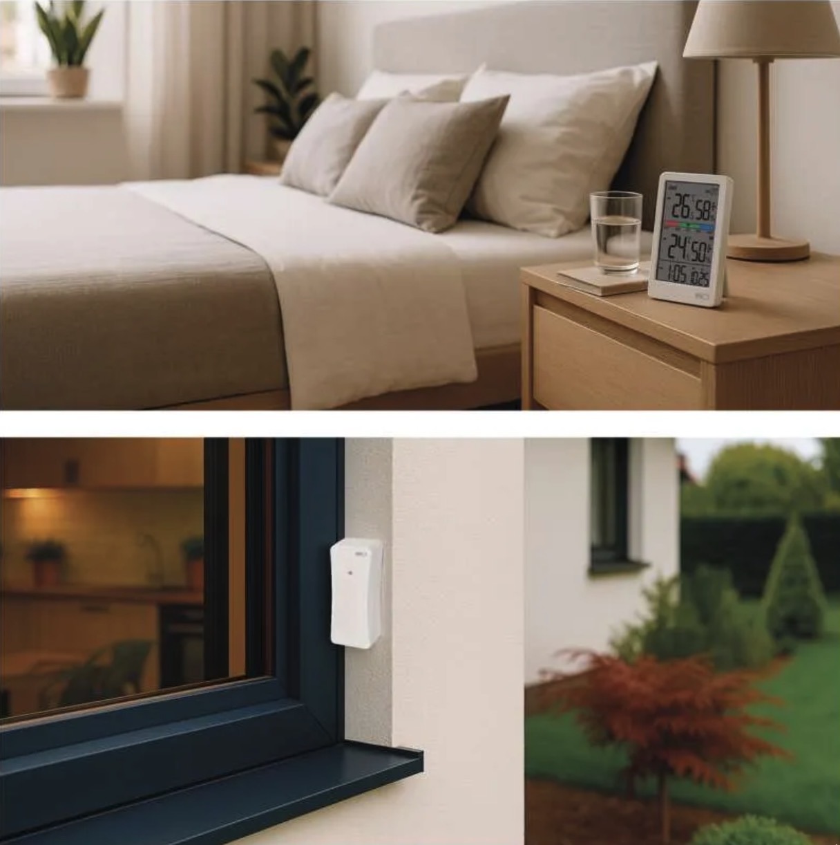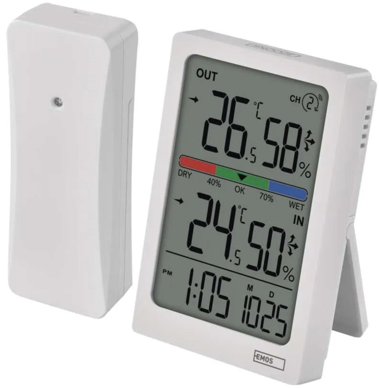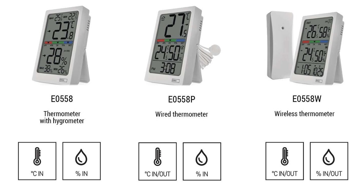 This modern wireless thermometer accurately displays indoor and outdoor temperature with 0.1°C resolution and measures relative humidity from 1% to 99%. It also features a temperature trend indicator and a three-level comfort indicator for quick assessment of indoor conditions.