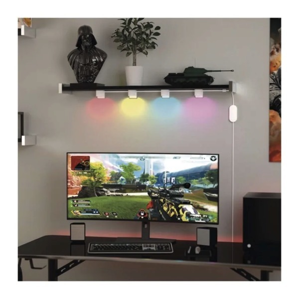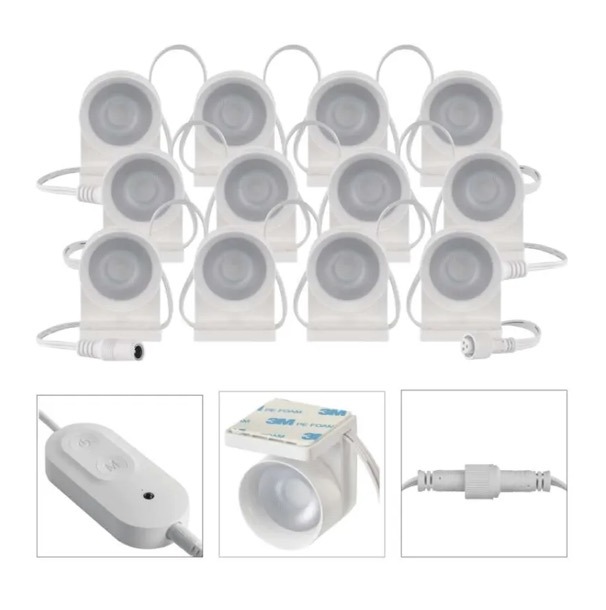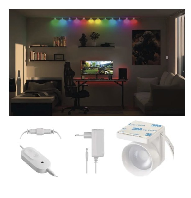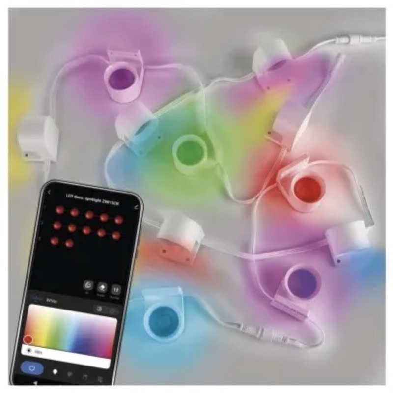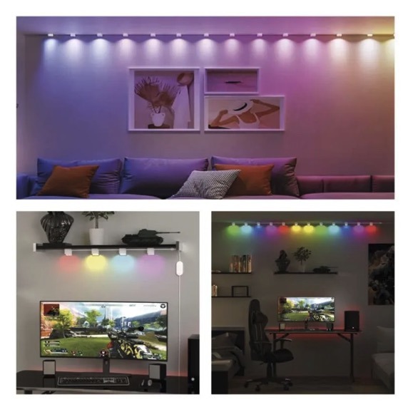 This smart LED spot lighting system with RGB IC and adjustable white light (CCT) is designed for decorative and accent lighting indoors. The 12-segment setup with a total length of 255cm allows flexible installation on walls, shelves, or workspaces, creating customized lighting effects.