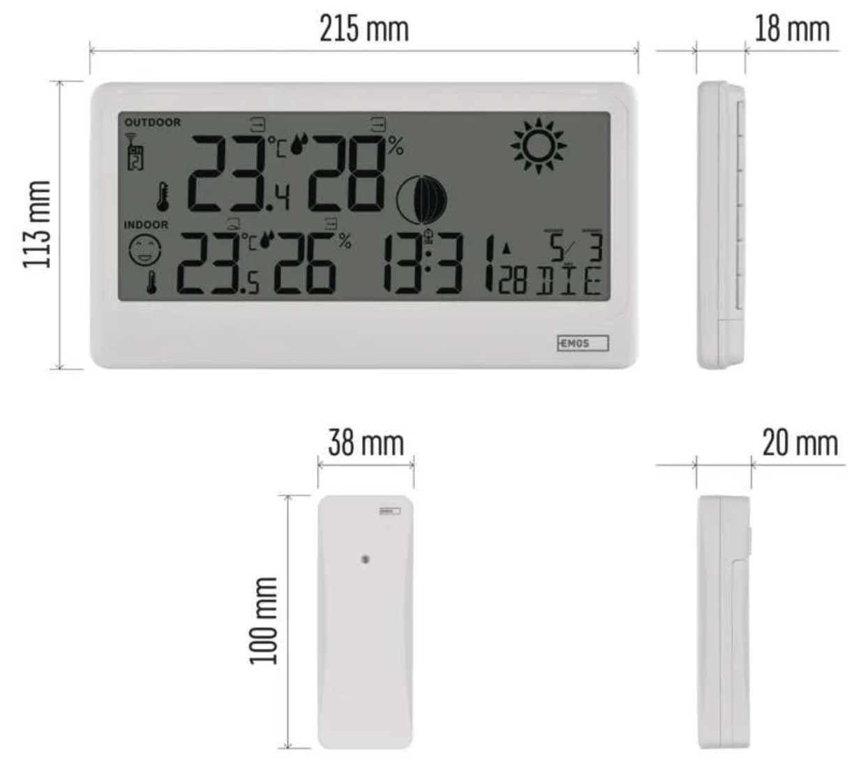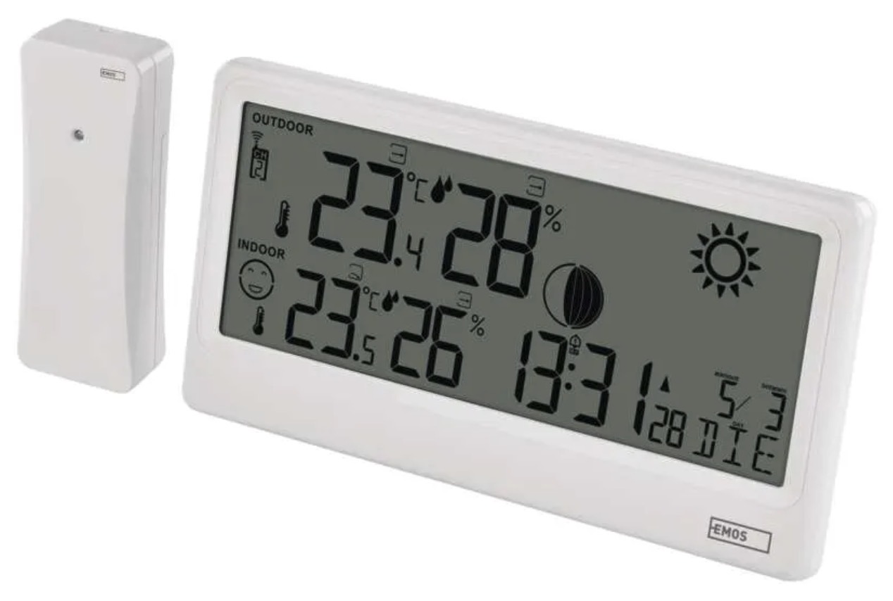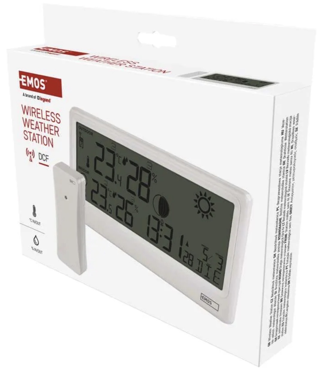 The weather station includes a DCF-controlled clock, alarm and multilingual calendar (including Czech, Polish, Hungarian and others). The large, clear display ensures easy readability.