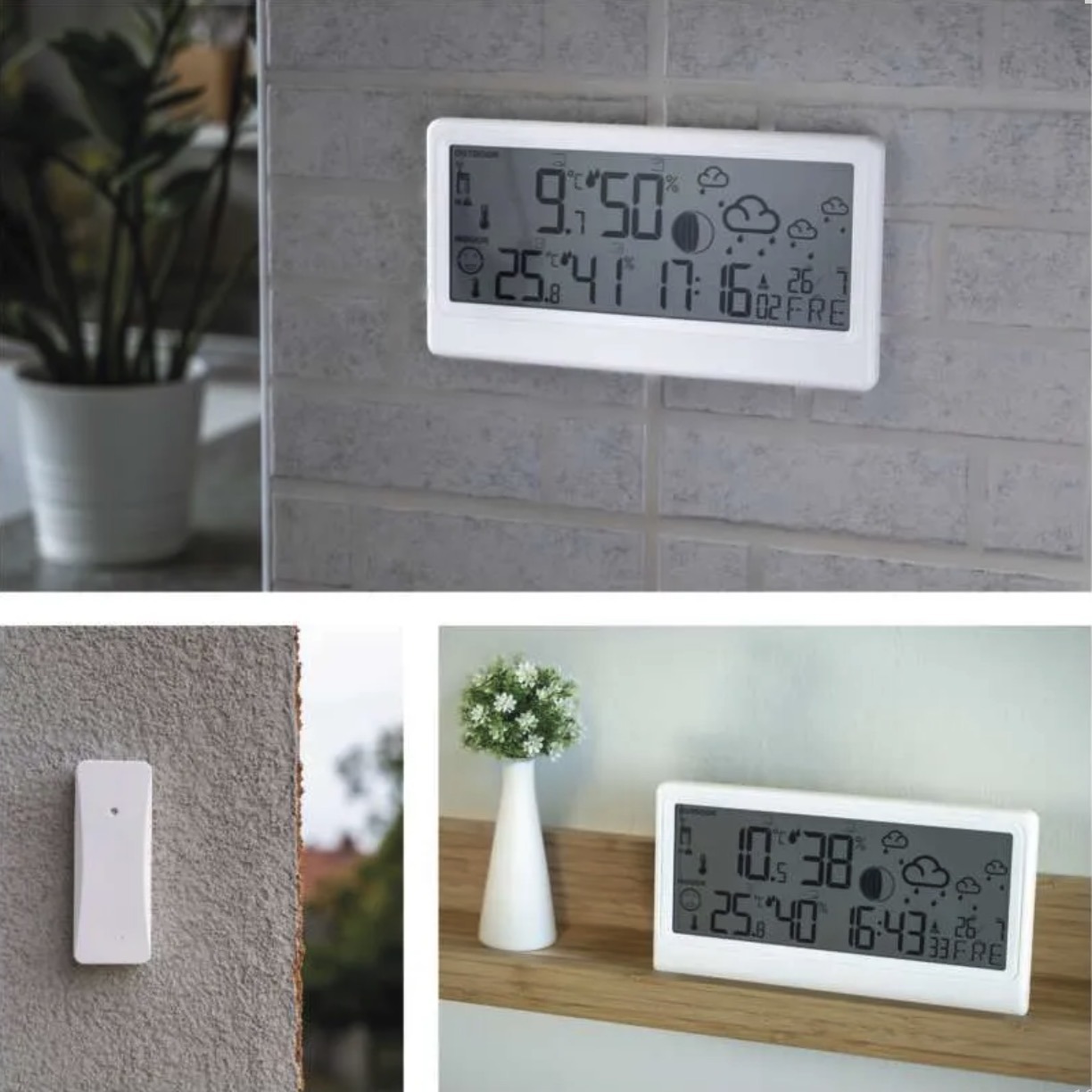 This premium wireless weather station is a reliable everyday assistant, providing accurate indoor and outdoor temperature and humidity measurements. It displays time, date, minimum and maximum temperatures, moon phases and weather forecast.