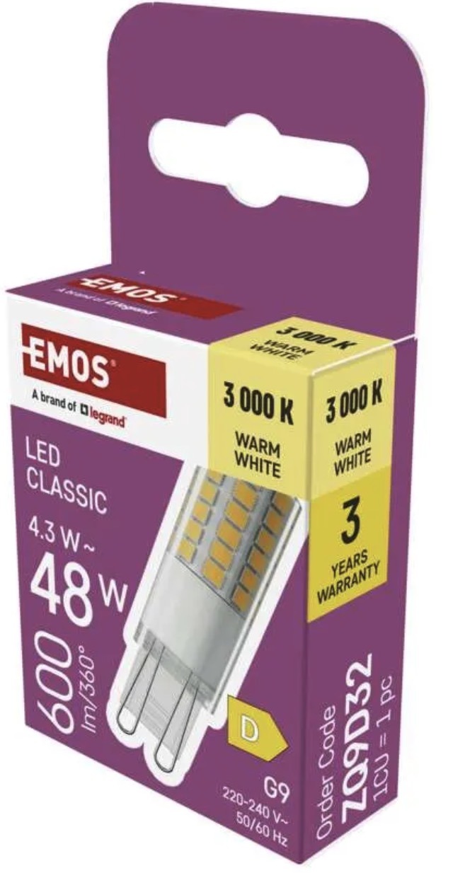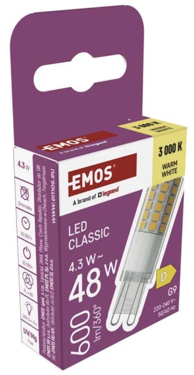 More powerful G9 LED bulb with warm white light for compact indoor lighting. It is suitable for fixtures where higher light output is needed with low power consumption.