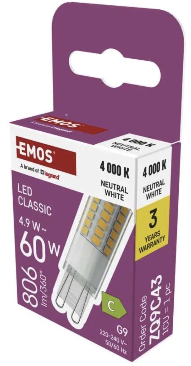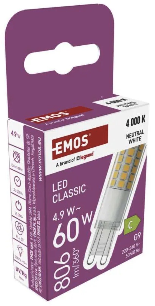 This G9 LED bulb is suitable for compact light fittings where bright and even illumination is needed with lower power consumption. It delivers 806lm, neutral white 4000K light and serves as a replacement for a 60W incandescent bulb.