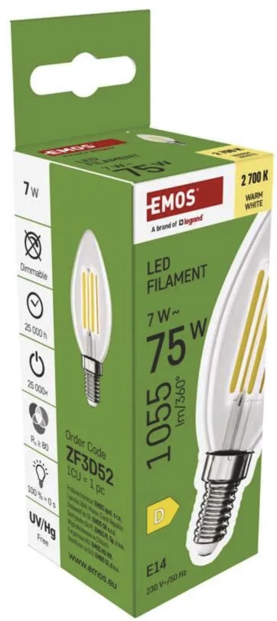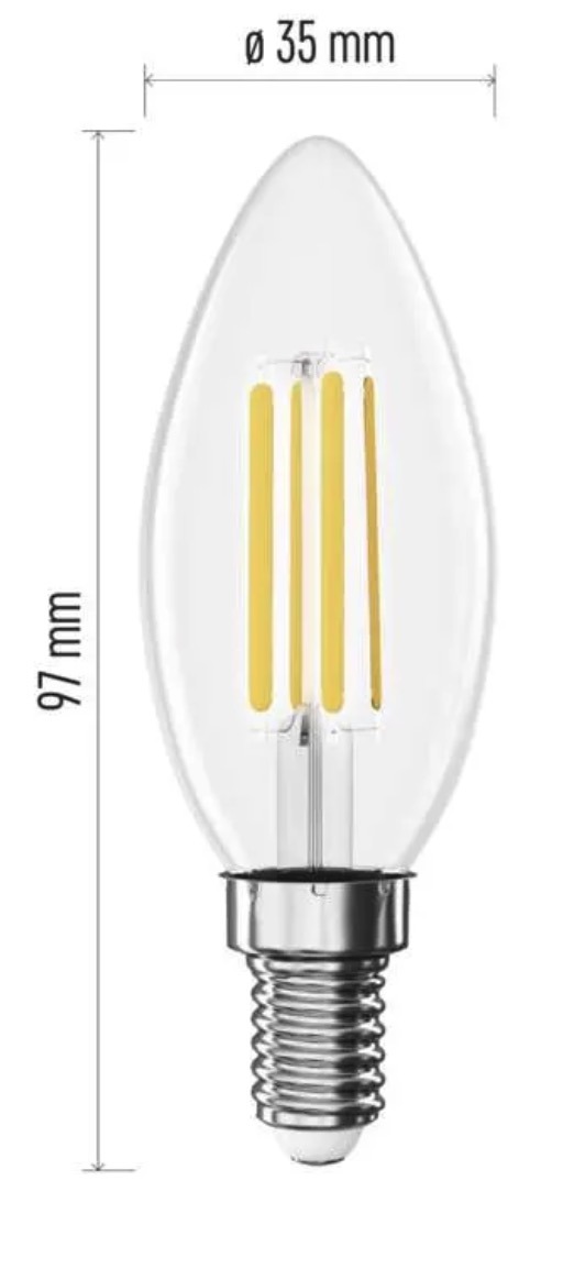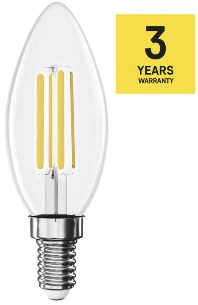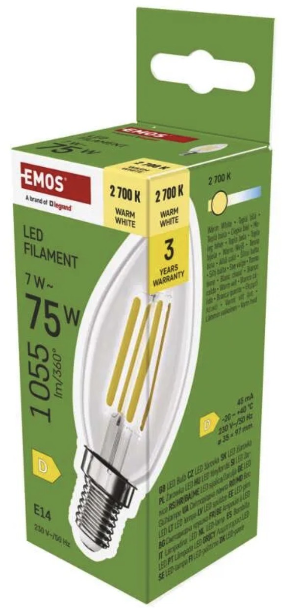 The EMOS LED Filament Candle bulb with E14 base is suitable for wall lamps, chandeliers and other decorative lighting fixtures where a compact shape and pleasant warm white light are important. With 1055lm output and a 360° beam angle, it provides even light distribution throughout the room.