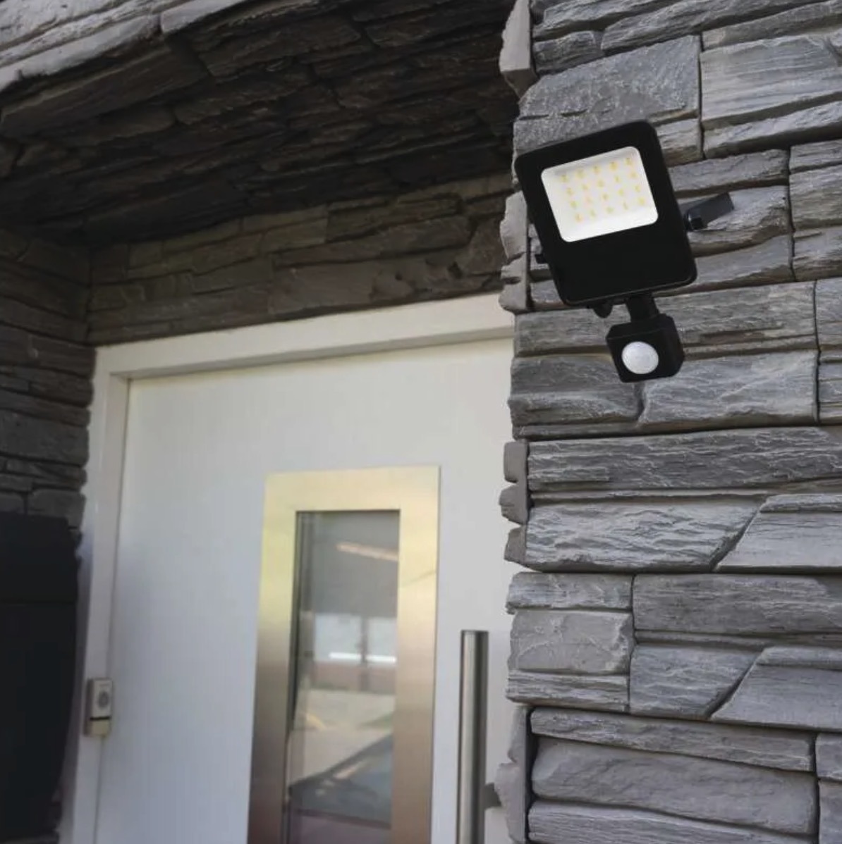 Its black aluminium body, IP54 protection and glass diffuser make it suitable for everyday indoor and outdoor use. The 10m motion sensor range helps switch the light on only when needed.