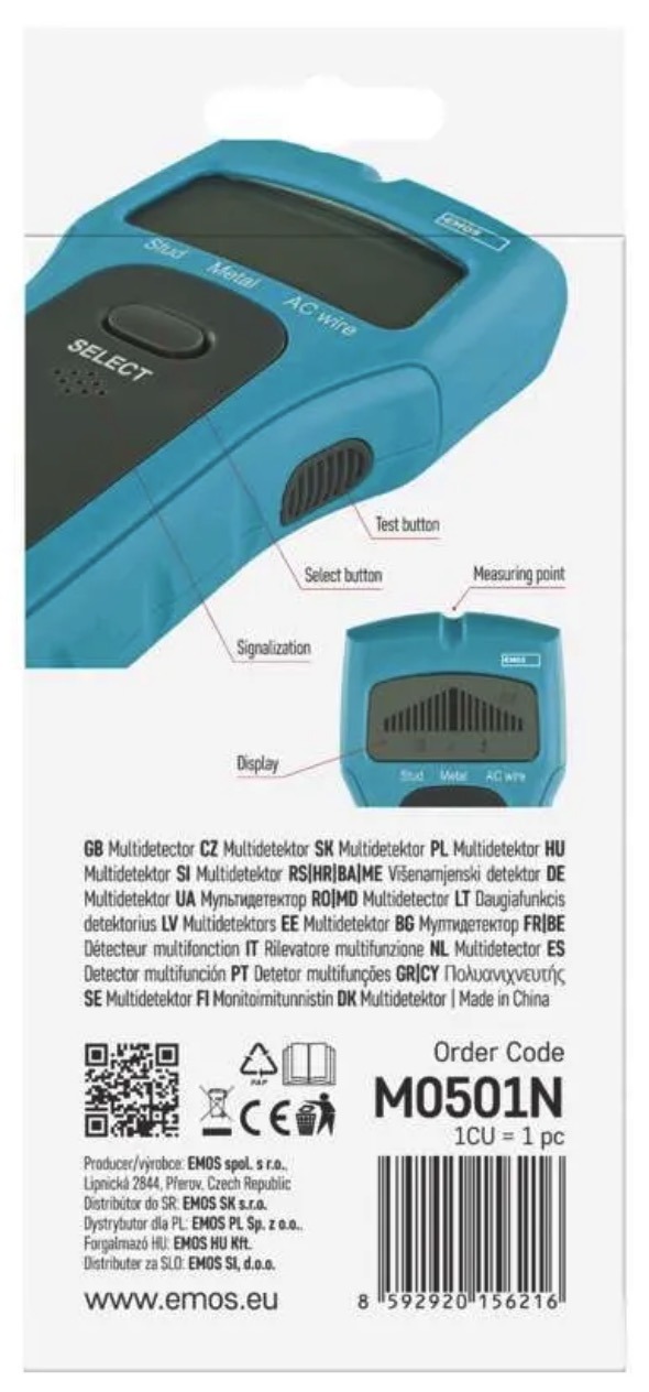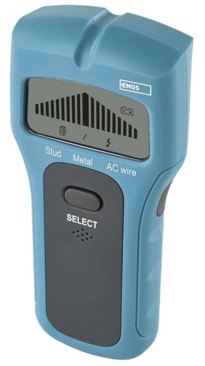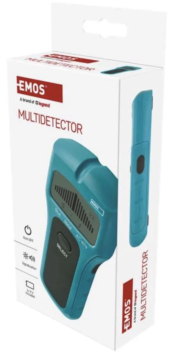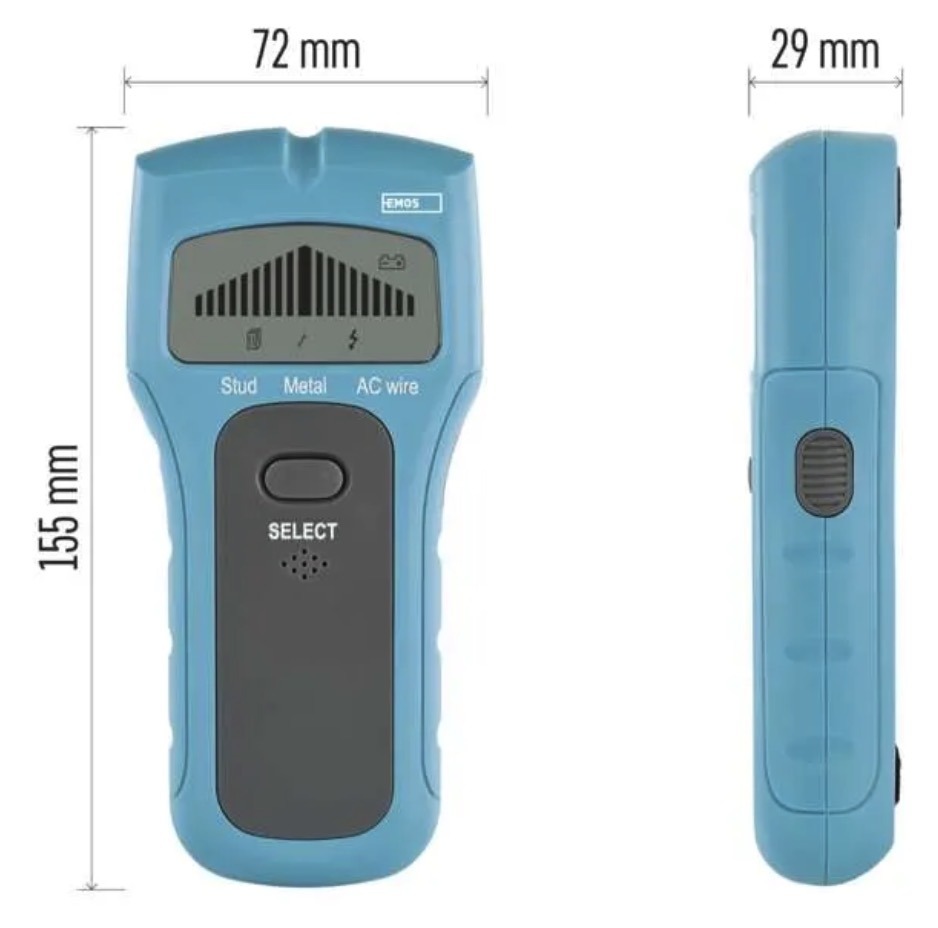 • Alarm: optical + acoustic• Detection: wood, metal, live AC wires• Automatic shut-off: yes• Dimensions: 28 × 72 × 155 mm• Power supply: 1 × 9 V battery (included)