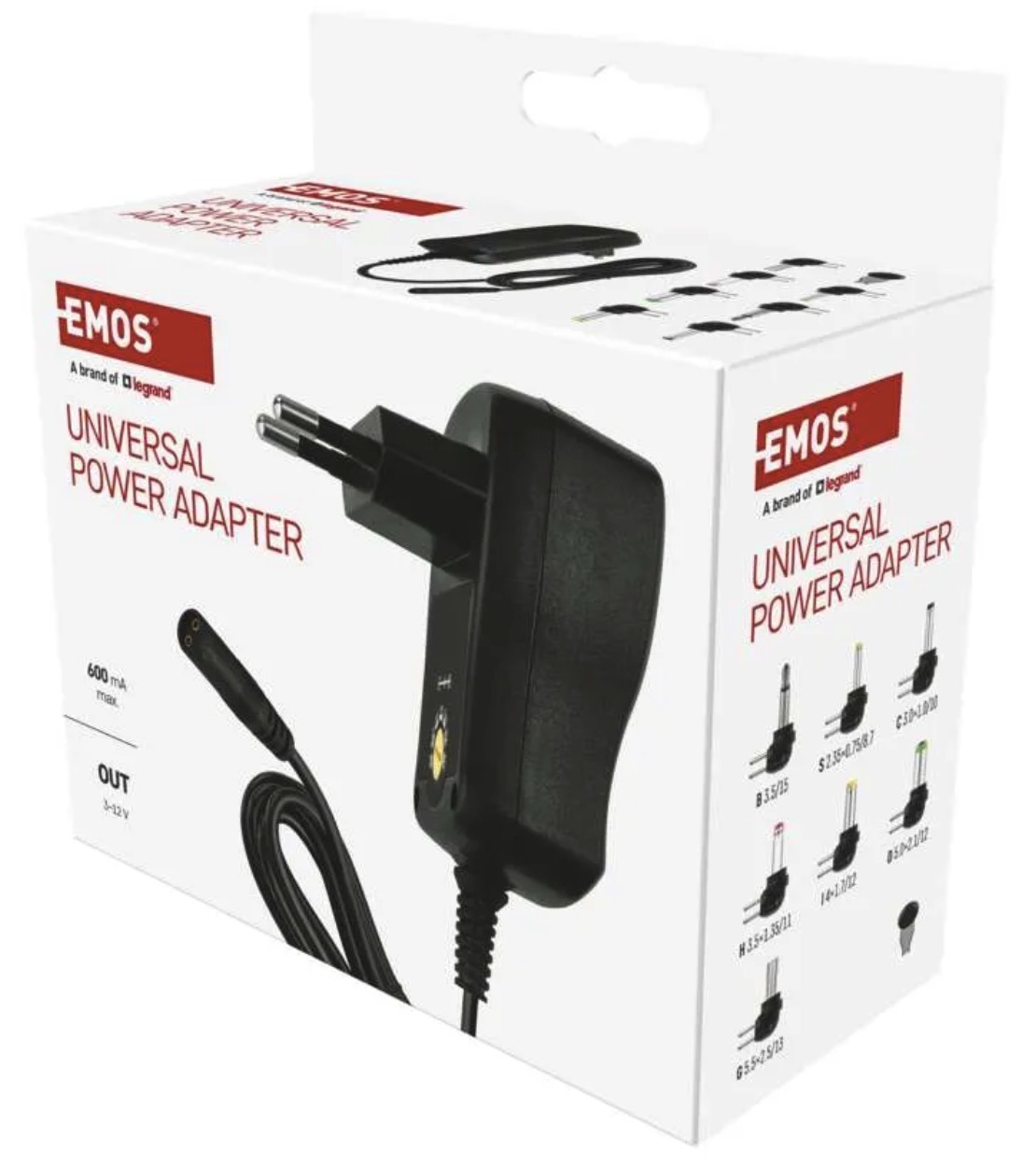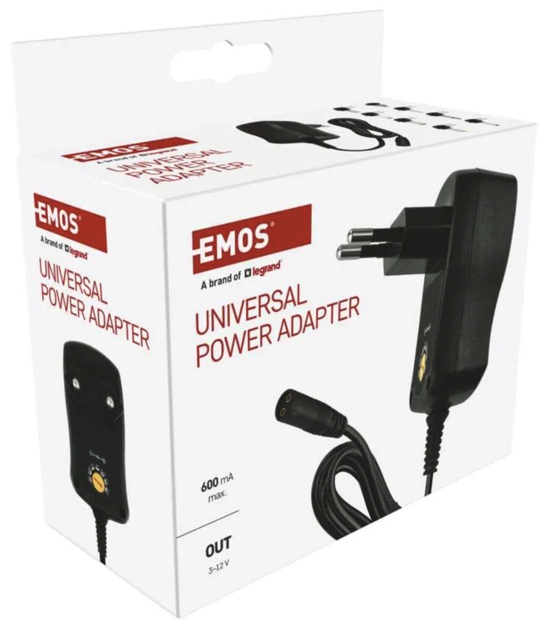 This universal power adapter is designed for powering various DC devices that require adjustable output voltage from 3V to 12V and up to 600mA current. It is a practical choice for compatible electronics where correct voltage selection is important.