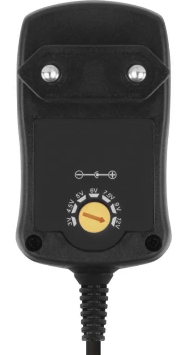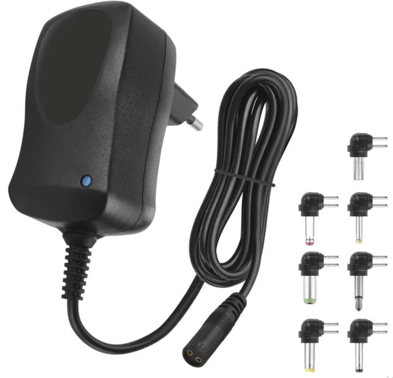 The package includes interchangeable power connectors for broader compatibility with different devices. The stabilised output voltage helps maintain the selected level regardless of load, while the approximately 1.5m cable makes everyday use more convenient.
