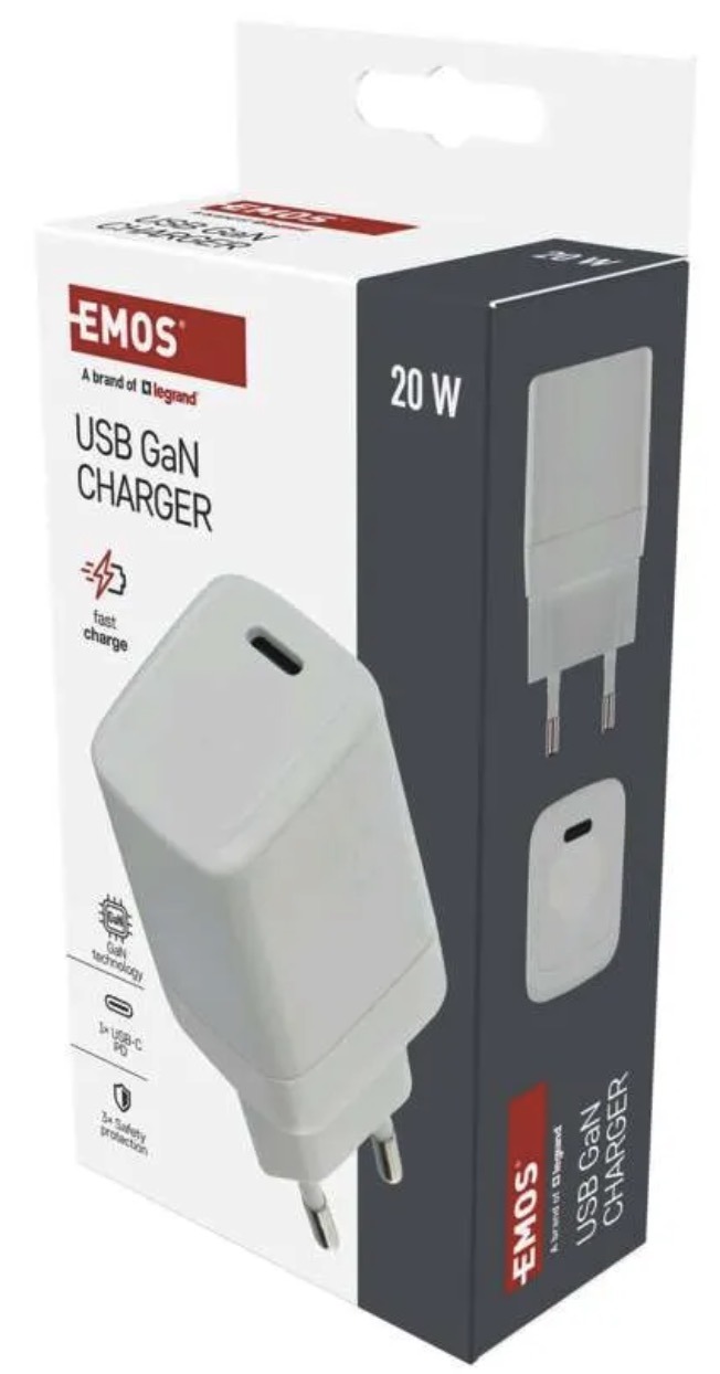The EMOS USB C charger with GaN technology is a compact and efficient solution for fast charging smartphones and tablets. It provides up to 20W power output and is suitable for everyday use at home, in the office or while travelling.