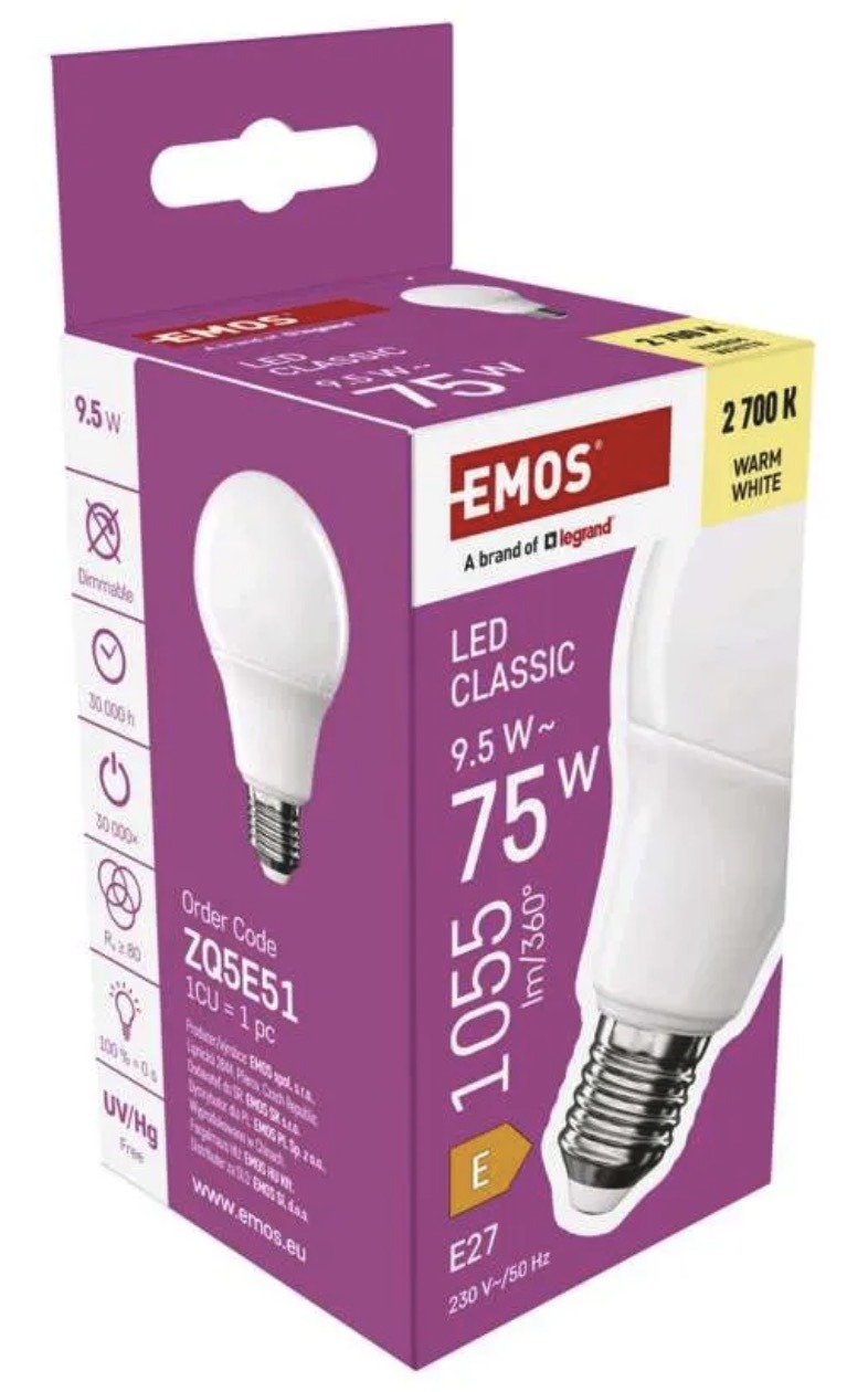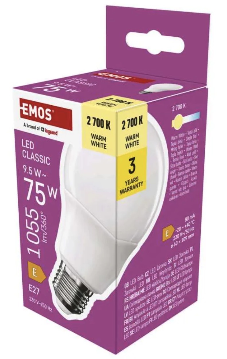 Efektīva un ekonomiska LED spuldze Classic A60 ar E27 cokolu, kas patērē tikai 9,5 W, bet nodrošina apgaismojumu, kas līdzvērtīgs 75 W kvēlspuldzei. Spuldze izstaro 1055 lūmenus silti baltu gaismu, radot patīkamu un komfortablu atmosfēru mājās vai darbā.