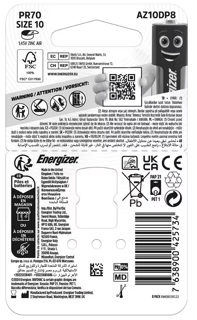 Piemērotas lielākajai daļai dzirdes aparātu, kas izmanto izmēru 10 PR70 baterijas. Iepakojumā 8 baterijas.