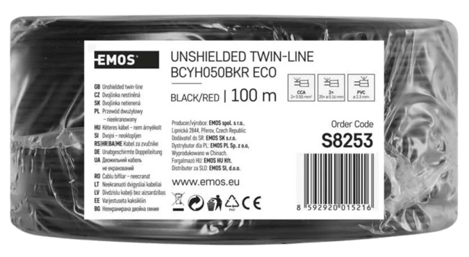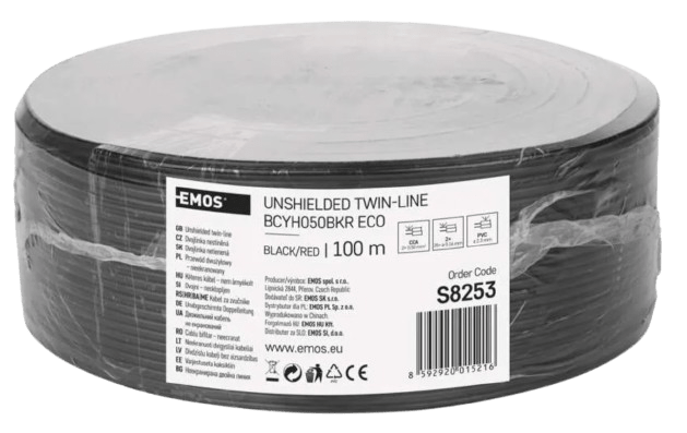 Неэкранированная двухжильная резьба (кабель) сечением 2×0,50 мм2. Двухжильный кабель имеет ЧЕРНУЮ изоляцию, один провод отмечен красной полосой. Оболочка кабеля изготовлена из ПВХ.