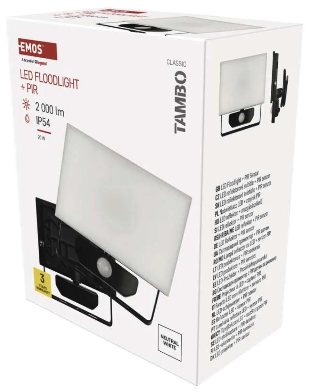 LED прожектор TAMBO с датчиком движения подходит для автоматического освещения у входов, во дворе и в рабочих зонах, где нужен более высокий световой поток. Он обеспечивает 2000lm, нейтральный белый свет 4000K и рассчитан на накладной монтаж.