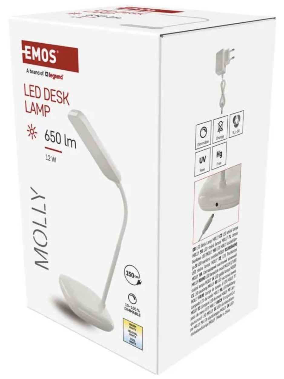 LED настольная лампа MOLLY подходит для работы, учёбы и повседневного использования там, где нужен регулируемый настольный свет. На официальной странице EMOS указаны световой поток до 650lm, белый цвет и плавное диммирование.