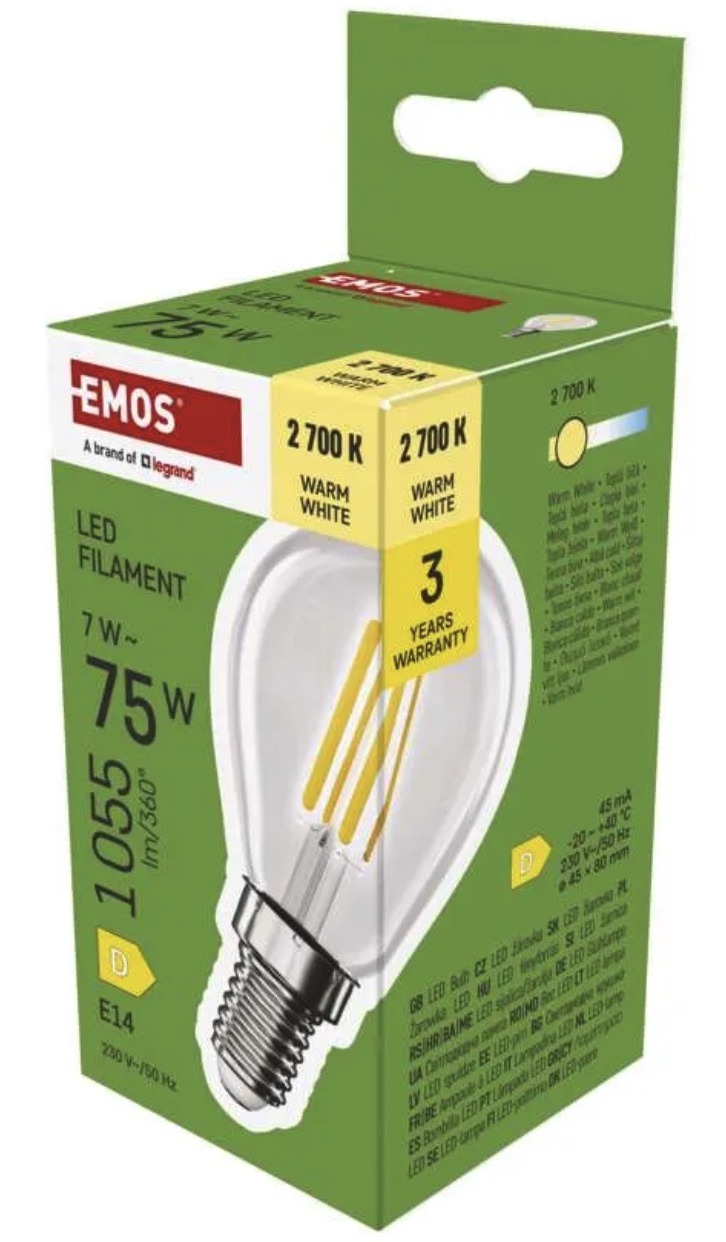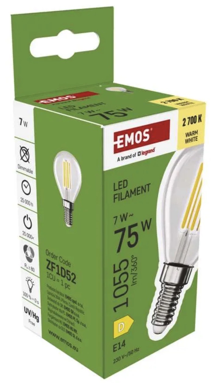 LED лампа EMOS Filament Mini Globe с цоколем E14 подходит для светильников, где нужна компактная лампа с ярким теплым белым светом. Световой поток 1055lm и угол свечения 360° обеспечивают равномерное распределение света как для декоративного, так и для повседневного освещения.