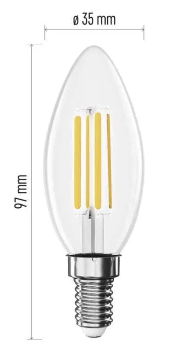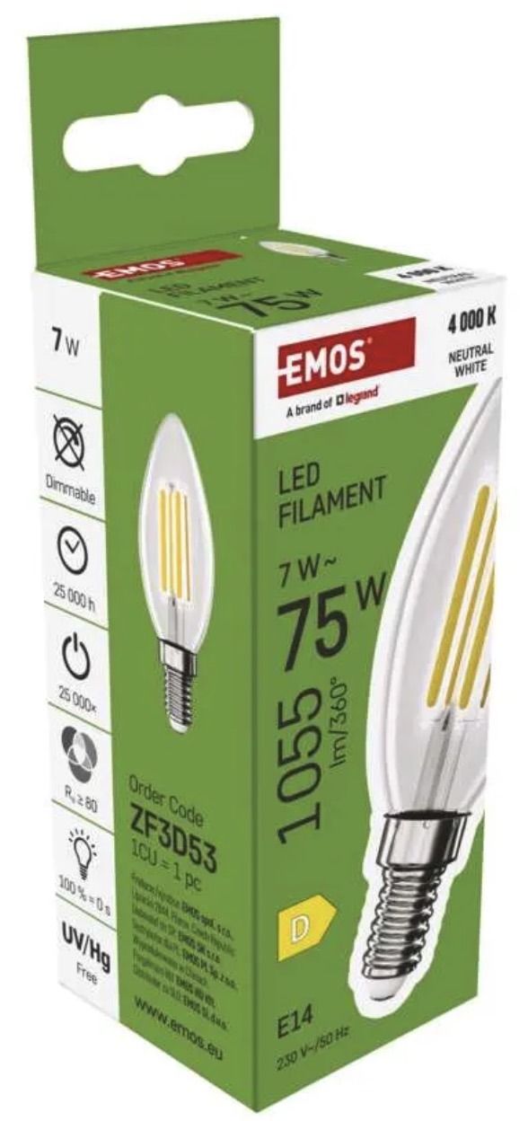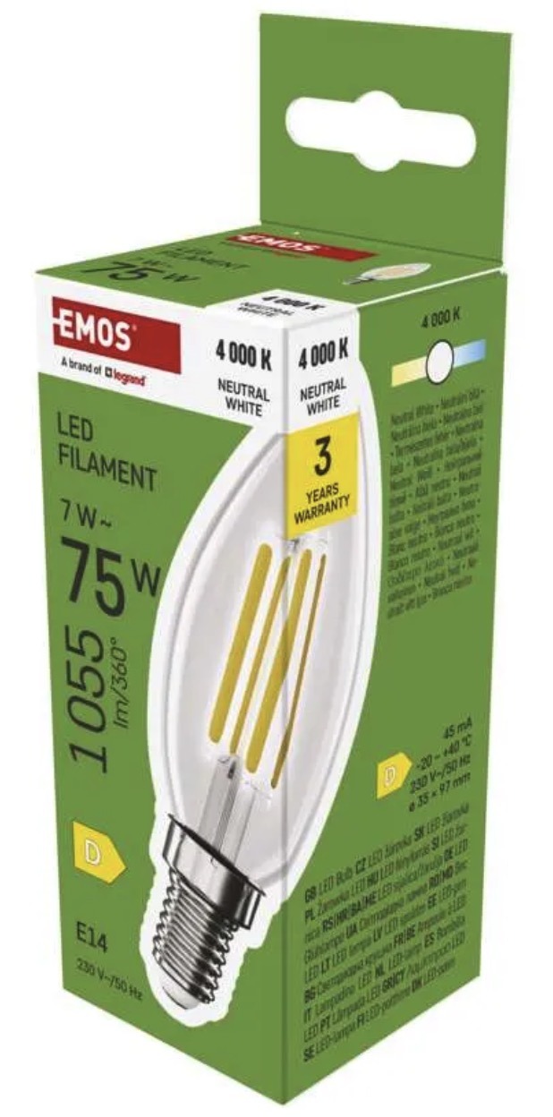 LED лампа EMOS с нитевой технологией Filament и цоколем E14 обеспечивает высокий световой поток 1055 лм и нейтральный белый свет 4000K. Она сочетает классический декоративный внешний вид со современной энергоэффективной LED технологией.