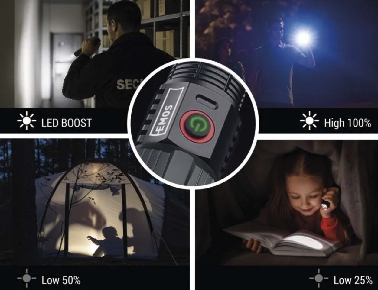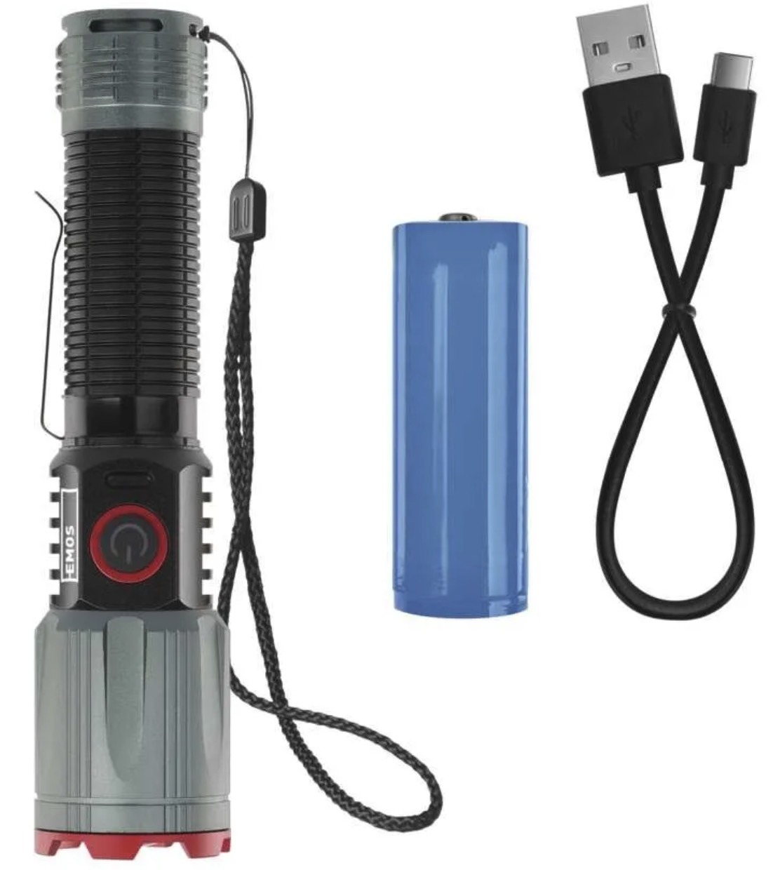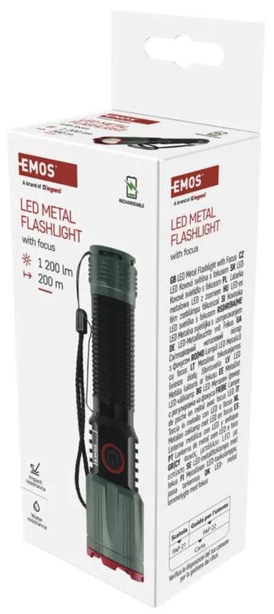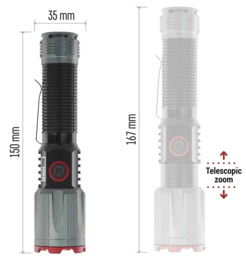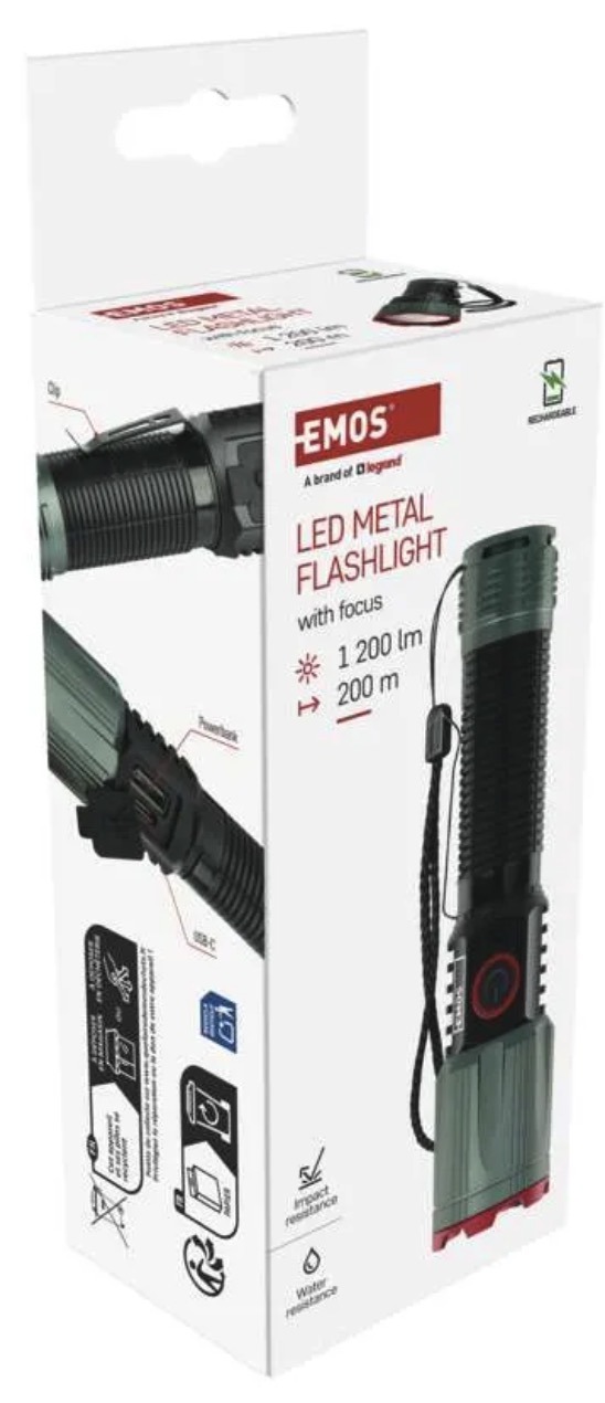 Модель имеет 4 режима освещения, зарядку через USB C, защиту IP43 и алюминиевый корпус. На официальной странице EMOS также указаны функции быстрого выключения, защиты аккумулятора и powerbank.