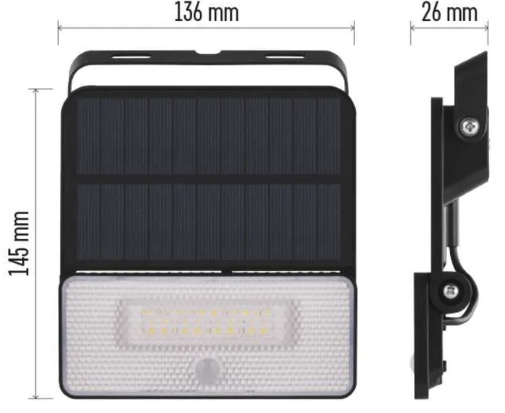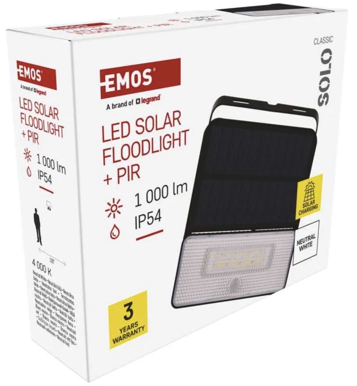 Солнечный LED прожектор SOLO предназначен для наружного освещения там, где нежелательно тянуть электропитание. На официальных страницах EMOS он указан как чёрная модель SOLO с датчиком движения и нейтральным белым светом.